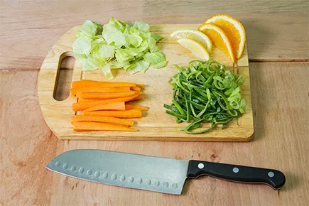 2. Каждую беби-морковь разрезать вдоль на 4 части. Салат нарезать кубиком. Порей – соломкой. Отрезать по 2 дольки от апельсина и от лимона.