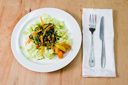 4. Сделать на тарелке подушку из листьев салата. Выложить сверху обжаренные овощи. На оставшемся от овощей сиропе обжарить дольки лимона и апельсина и подать их вместе с салатом.