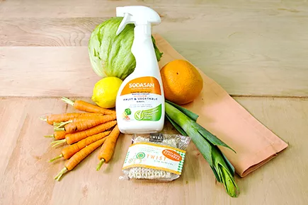 1. Перед приготовлением блюда нам необходимо помыть ингредиенты с помощью органического средства «Sodasan», предназначенного специально для мытья овощей и фруктов, и губки из натуральной агавы.