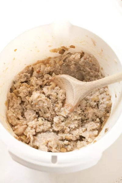 6. Смешать гречку, обжаренные лук и грибы, взбитое яйцо и немного муки.