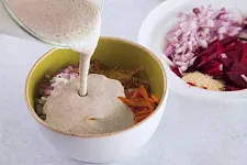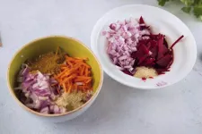 Разложите тертую морковь и свеклу по разным мискам. Лук мелко нарежьте, разделите на две равные части и добавить к моркови и свекле