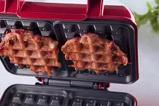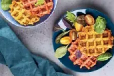Пеките вафли, добавляя на одну штучку примерно три ложки теста. Из этого количества выйдет 4 морковных вафли и 4 со свеклой