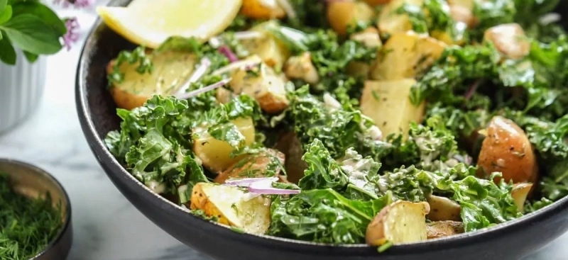 5. В миску для салата выложите кейл, добавьте немного оливкового масла и разомните руками, чтобы листья стали более нежными и пропитались маслом. Добавьте готовый картофель с чесноком, лук и укроп.