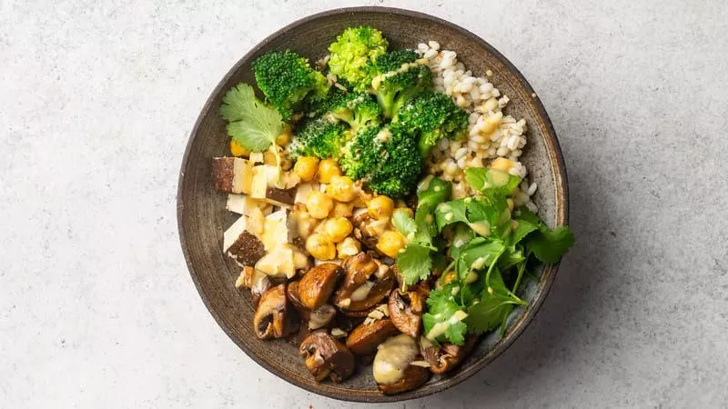 5. Выложите в миску готовую перловку, брокколи, нарезанный тофу, шампиньоны, нут, кинзу. Заправьте смесью горчицы и майонезного соуса.
