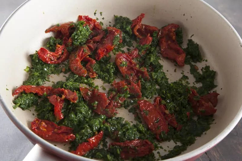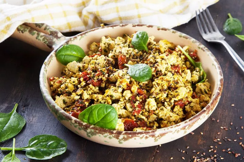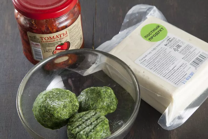 В сковороде разогрейте оливковое масло (или используйте масло от вяленых томатов), выложите замороженный шпинат, накройте крышкой и дайте разморозиться на небольшом огне. Вяленые томаты выньте из масла, порежьте кусочками добавьте к шпинату, увеличьте нагрев и готовьте еще минуту. Тофу раскрошите руками прямо в сковороду, добавьте куркуму и соль, готовьте, помешивая, 2-3 минуты. Готовый омлет подавайте горячим, посыпав семенами кунжута!