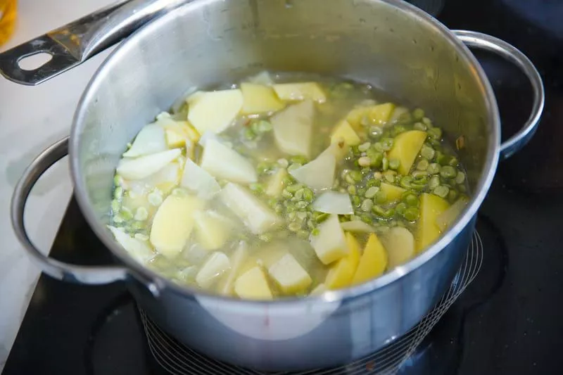3. Обжарьте лук и чеснок на оливковом масле прямо в кастрюле, затем добавьте картофель и горох вместе с водой, влейте еще 1 литр воды и варите до готовности гороха.