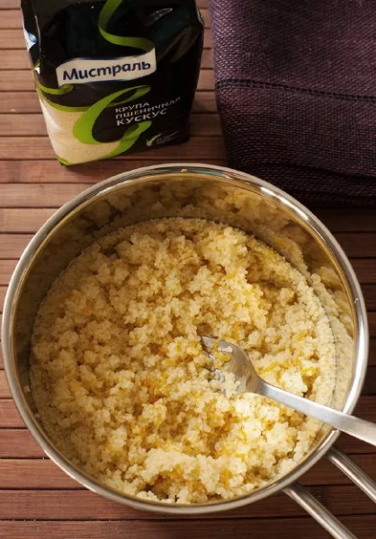 3. Вскипятить 3/4 чашки (185 мл) воды. Смешать с апельсиновым соком, сливочным маслом, столовой ложкой сиропа и тертой цедрой. Залить смесью кускус, закрыть крышкой и оставить на 5 минут. Готовый кускус слегка размять вилкой, дать полностью остыть.