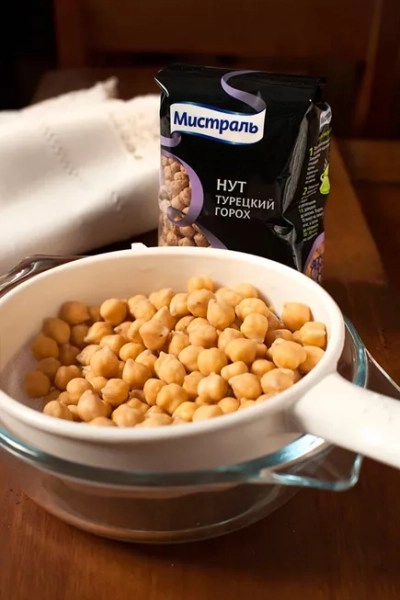1. Нут промыть, залить холодной водой, оставить минимум на 4 часа (можно на ночь). Слить воду, выложить нут в большую кастрюлю, залить свежей водой в соотношении 1:5, поставить на сильный огонь. После закипания убавить огонь и варить около 1 часа до готовности.