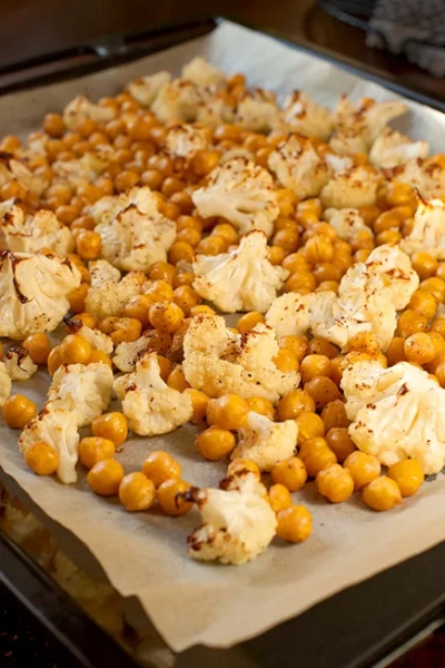 2. Нагреть духовку до 220 С. Разобрать цветную капусту на небольшие соцветия, Капусту и нут приправить солью и перцем, добавить 2 стол ложки оливкового масла, перемешать. Выложить на противень, покрытый бумагой для выпечки. Запекать в духовке около 25 минут, цветная капуста должна стать мягкой, а нут хрустким.