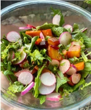 6. Сверху посыпьте салат редиской и добавьте заправку. Смешайте все вместе и подавайте.